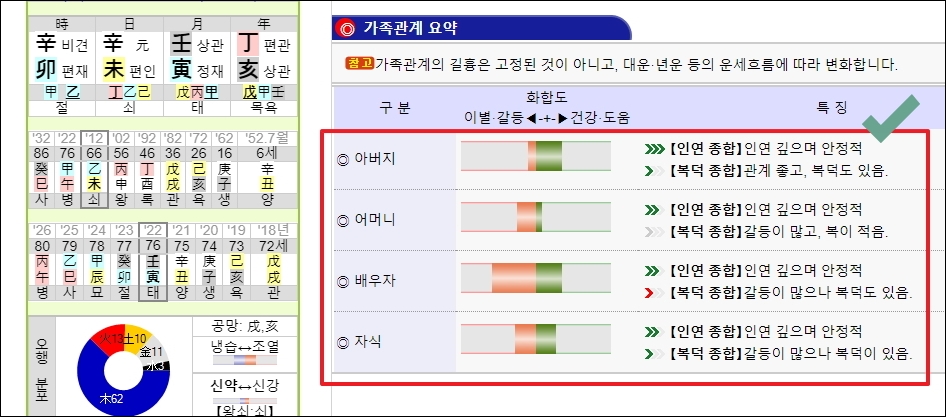 ▼이번에는 가족관계에 대한 풀이를 읽어볼 수 있습니다. 아버지, 어머니, 배우자, 자식에 대한 내용입니다. 화합도와 특징을 통해 인연과 갈등, 복덕에 대한 것을 알아볼 수 있습니다. 화면 왼쪽을 보면 나의 오행 분포와 사주명식, 대운, 일운을 알아볼 수 있습니다. 사주풀이에 대해 공부한 사람만 해석이 가능한 부분이기 때문에 이러한 것이 있다는 정도만 알고 넘어가는 것이 좋습니다.