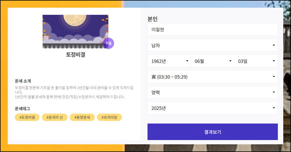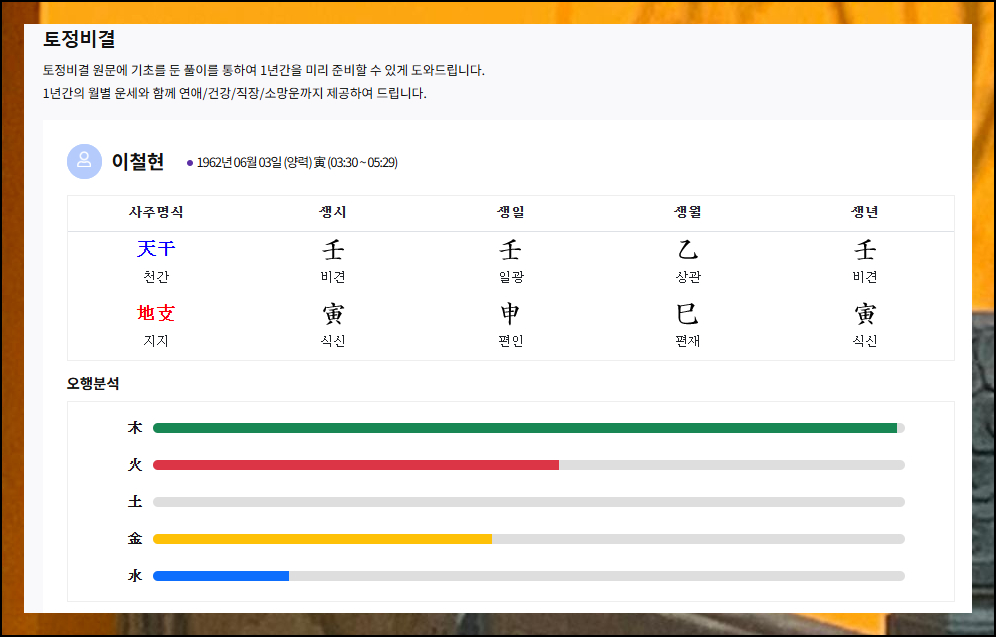 신뢰도 높은 역술 전문 사이트에서는 상세한 풀이부터 월별운까지 한눈에 볼 수 있습니다. 오행 분석과 사주풀이를 통해 올해의 기회와 위험 요소를 미리 파악할 수 있죠. 지금 바로 나의 운명을 확인해보세요.