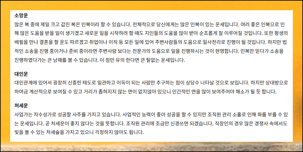 무료로 제공되는 운세는 매우 자세하게 설명되어 있어요. 좋은 일은 어떻게 발전시키고, 조심해야 할 일은 어떻게 대처해야 하는지 꼼꼼하게 알려줍니다. 사주 보기를 통해 미리 대비하면 좋죠.