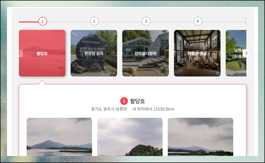 여러 곳을 연계해서 탐방하면 더욱 풍성한 경험이 됩니다. '대한민국 구석구석'에서는 서울근교 당일치기 여행 루트도 추천해드려요. 코스별 총 이동거리를 체크하면 소요시간도 예측 가능하니 갈만한곳들을 효과적으로 둘러볼 수 있어요.