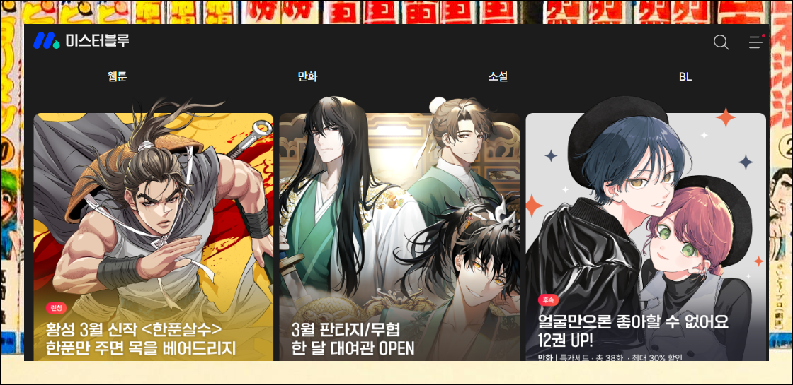미스터블루는 웹툰, 만화, 소설 등 여러 가지 볼거리가 많은 플랫폼이에요. 특히 황성 작가의 작품을 포함한 다양한 무료 만화를 감상할 수 있는 행사를 자주 개최하니 놓치지 마세요. 페이지에 접속하셨다면 상단에 위치한 '만화' 메뉴를 선택해주세요.