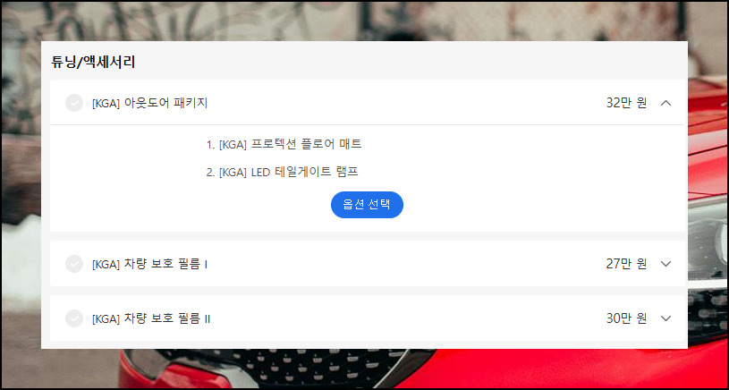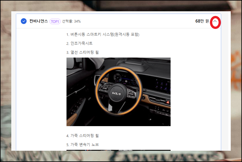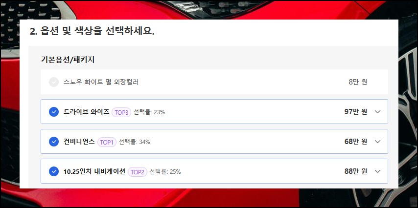 신차 옵션에는 드라이브 와이즈, 컴포트, 헤드업 디스플레이, 하이패스 시스템 등 다양한 종류가 있어요. 기아자동차를 처음 접하는 분들은 옵션명만으로는 기능 파악이 어려울 수 있습니다. 이런 경우 옵션명 옆 아이콘을 클릭하면 상세 설명을 확인할 수 있으니 참고하세요. 옵션은 자동차 가격에 영향을 미치므로 신중히 결정하는 것이 좋아요.