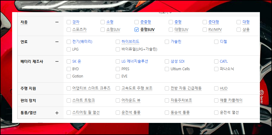 이미 눈여겨본 기아자동차 모델이 있으신가요? 특별히 관심 있는 차종이 없다면 상세 검색 기능을 활용해보세요. 차종, 옵션, 연료 타입을 선택하면 조건에 맞는 차량 목록이 표시됩니다. 이 맞춤형 탐색으로 수많은 선택지 중에서 나에게 가장 적합한 것을 발견할 수 있어요.