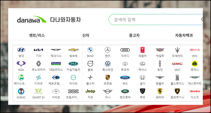다나와 자동차 포털에 접속하면 현대, 기아, 제네시스부터 쉐보레, 쌍용까지 다양한 국산차와 수입차 브랜드를 볼 수 있어요. 기아자동차 정보를 확인하려면 해당 로고를 클릭하세요. 메뉴를 보면 아시겠지만, 신차는 물론이고, 중고차나 렌트, 리스에 대한 정보도 풍부하게 제공하는 곳입니다.