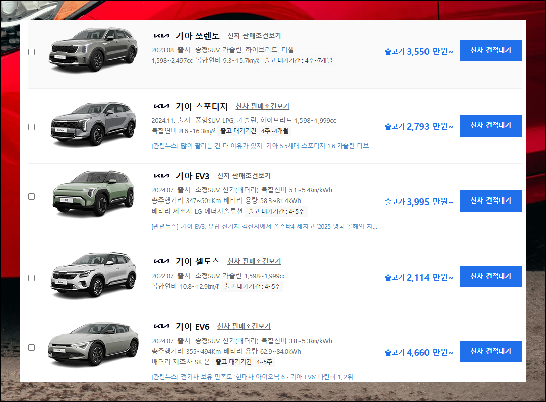 최근에는 다목적으로 활용 가능한 SUV가 트렌드인데요, 기아자동차에서는 쏘렌토, 스포티지, EV3, 셀토스의 인기가 높은 것으로 보입니다. 화면의 가격 정보는 범위로 표시되어 있지만, 더 정확한 금액을 알아보는 방법이 있으니 걱정하지 마세요.