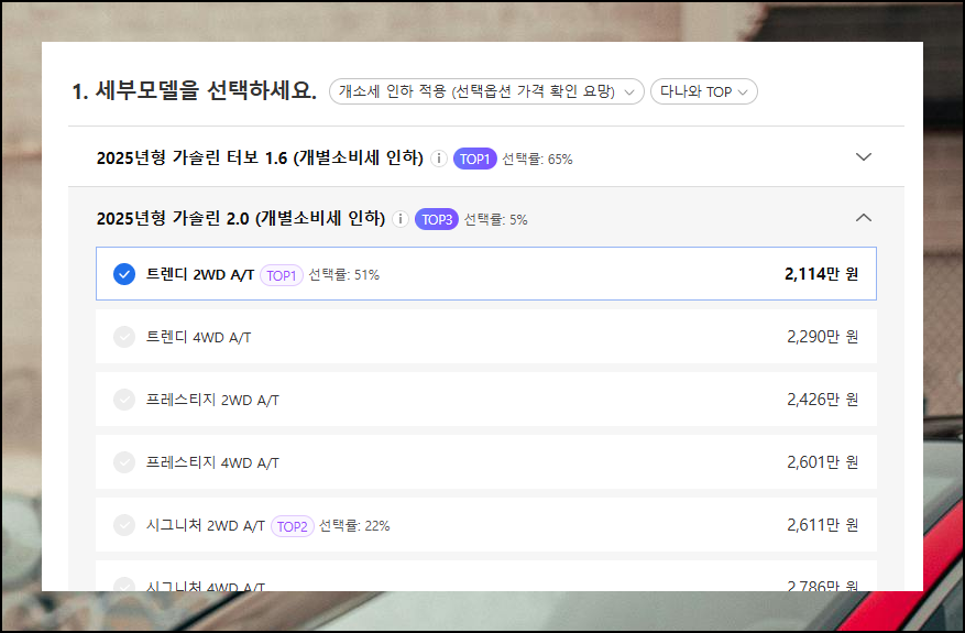 새 페이지에서 정확한 신차가격표를 확인할 수 있어요. 이제 세부모델과 다양한 기능을 신중하게 선택해주세요. 이 과정에서 본인의 필요 사항에 맞는지 고려하는 것이 좋습니다. 특정 세부모델을 선택하면 일부 옵션을 추가할 수 있거나 반대로 옵션을 추가하지 못할 수 있거든요.