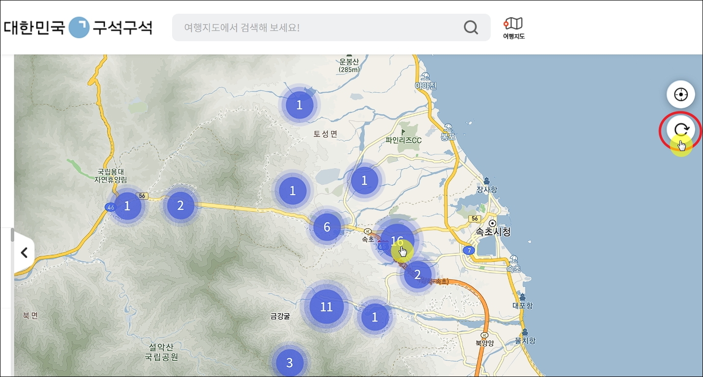 ▼새롭게 열린 페이지를 보면 우리나라 지도가 화면이 나타납니다. 여기에서 관광지를 알아보고 싶은 곳이나 여행하고자 하는 지역을 찾아 주세요. 그 다음 우측 상단에 있는 재검색 버튼을 클릭합니다. 그럼 화면에 숫자 표시가 나타나는데, 해당 숫자는 관광명소에 갯수를 의미합니다.