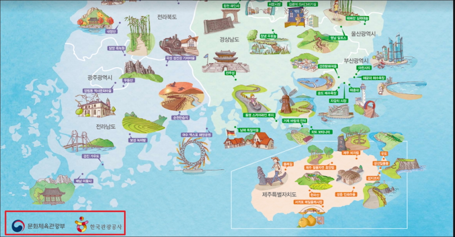 ▼자료는 PDF 파일로 되어 있습니다. 문화체육관광부와 한국관광공사에서 제작 및 배포를 했다는 표시가 되어 있습니다. 전라도와 경상도, 제주도 지역의 관광지도 쉽게 파악할 수 있도록 되어 있습니다. 하단에 파일을 첨부했으나 최신 자료를 다운 받고 싶을 때에는 대한민국 구석구석 사이트에 접속하셔서 받으면 됩니다.