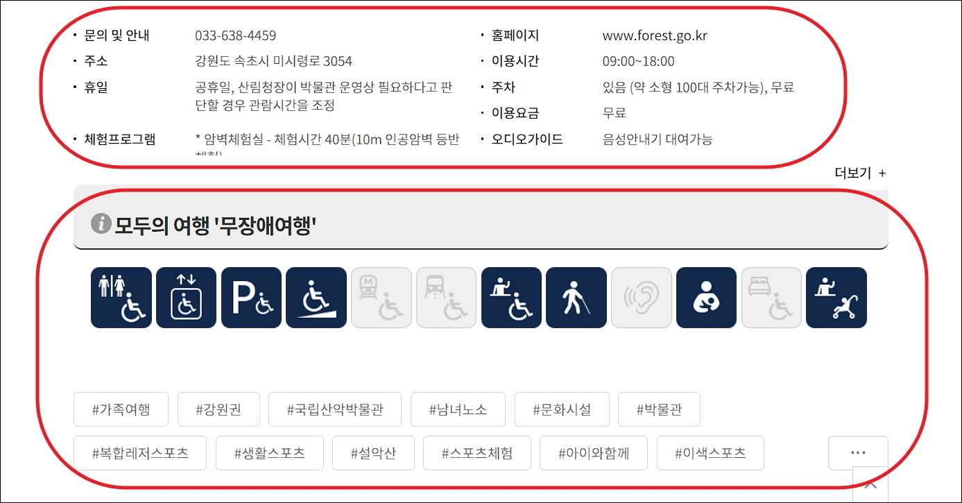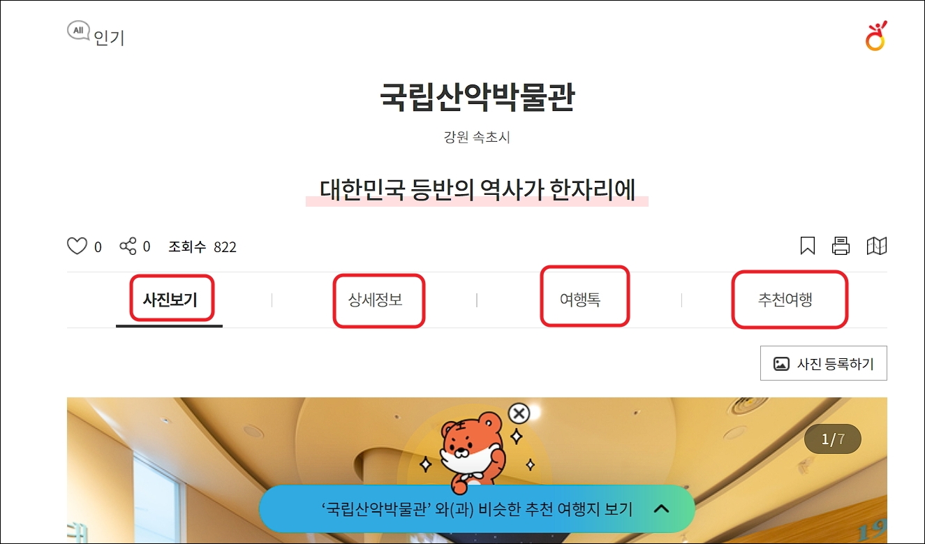 ▼저는 강원도 속초시에 있는 국립산악박물관을 클릭해 보았습니다. 새로운 알림 페이지를 통해 많은 사진, 상세정보, 여행톡, 추천 여행 정보를 확인할 수 있었습니다.