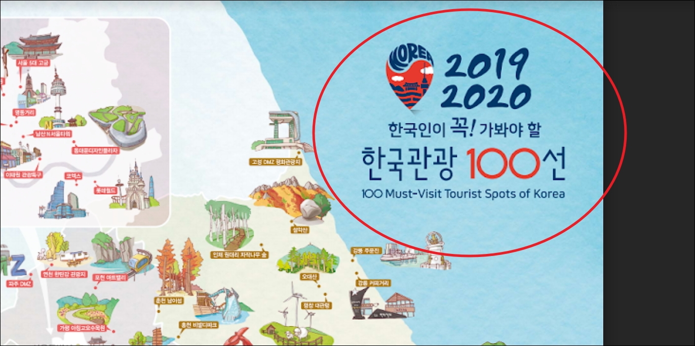 ▼이번 포스팅에서 다운 받을 수 있는 자료는 다음과 같습니다. 2019년과 2020년에 선정된 우리나라 관광 100선으로 만들어진 지도 파일입니다. 아기자기한 그림과 관광지 이름이 잘 표시되어 있습니다. 여기에 더하여 상세한 여행 정보를 얻는 방법을 알려 드릴테니 함께 이용해 보시길 바랍니다.