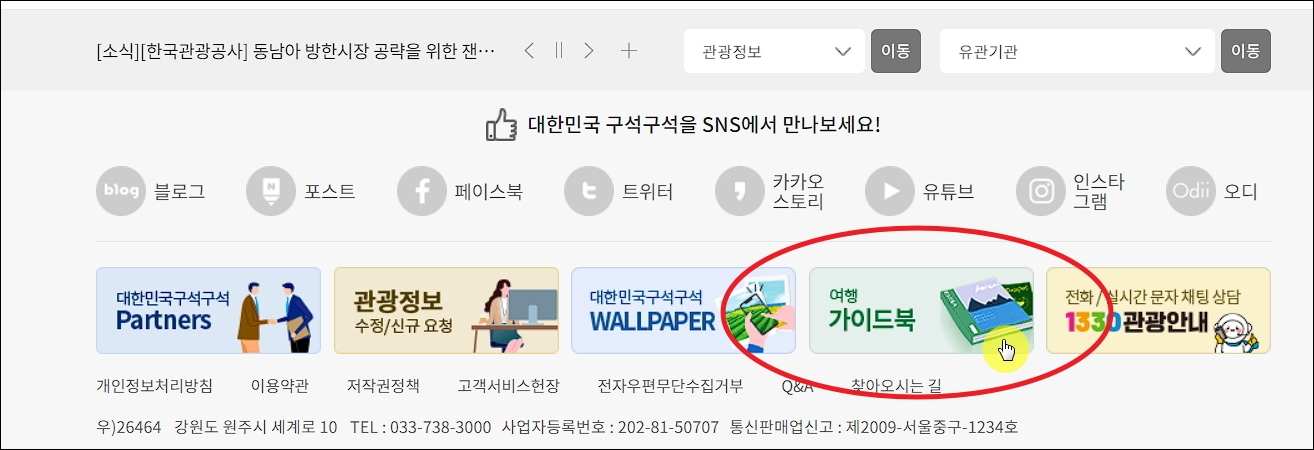 ▼여행가이드 페이지가 열렸습니다. 여기에는 우리나라 여행에 도움이 되는 다양한 가이드북 자료를 내려받을 수 있는 곳입니다. 여기에서 페이지를 넘겨보면 한국관광 100선 자료가 나타납니다.
