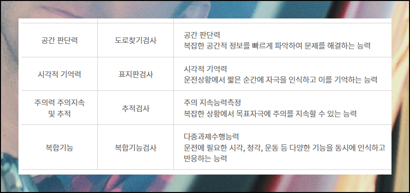 해당 테스트는 시야각 측정부터 복합기능 수행까지 총 7가지 항목으로 구성되어 실제 도로 상황에서 필요한 핵심 능력을 종합적으로 평가합니다. 그럼 안전한 도로 환경을 위해 지금 바로 신청해보세요.