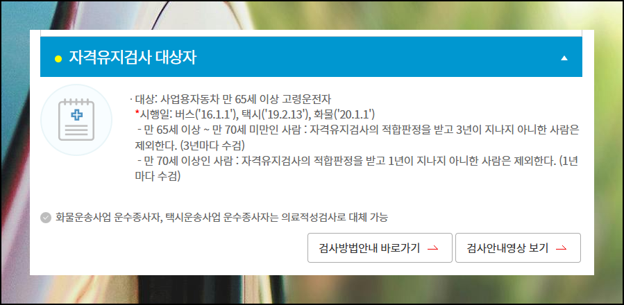 자격유지검사는 사업용 차량을 운행하는 만 65세 이상 고령운전자가 대상입니다. 만 65세에서 70세 미만인 분은 3년마다, 만 70세 이상인 분은 매년 받아야 해요. 화물운송이나 택시 사업에 종사하시는 분들은 다른 유형의 자격시험으로 대체할 수 있는 옵션도 있습니다.