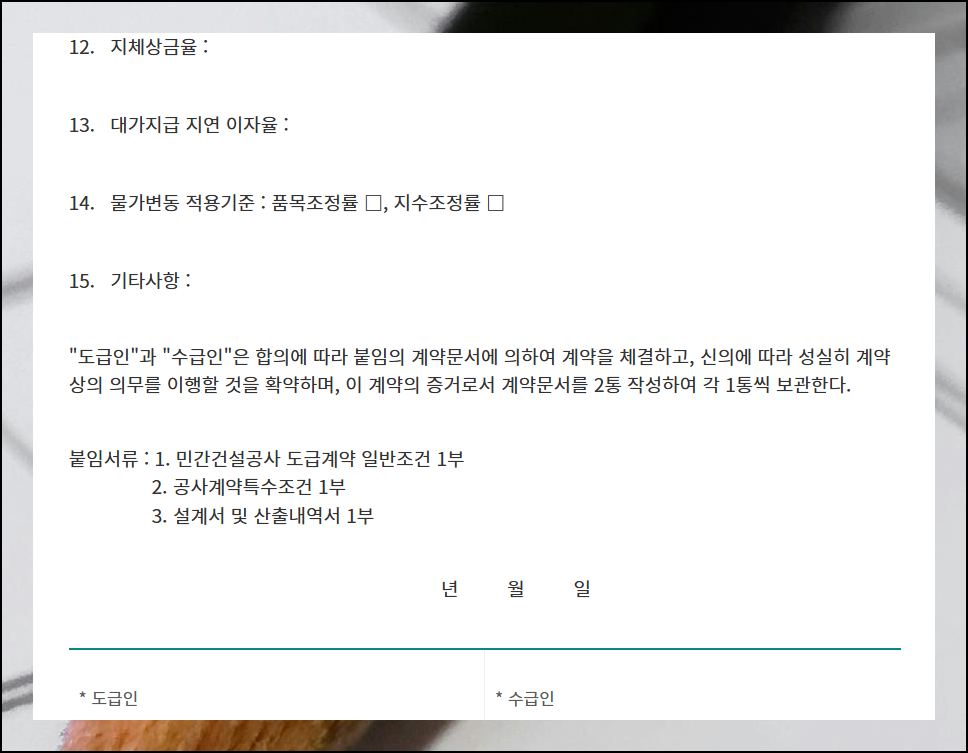 최신 민간건설공사 계약문서는 변경된 법적 요건과 업계 기준이 반영되어 있어 더욱 안전한 공사 약정 체결이 가능합니다.