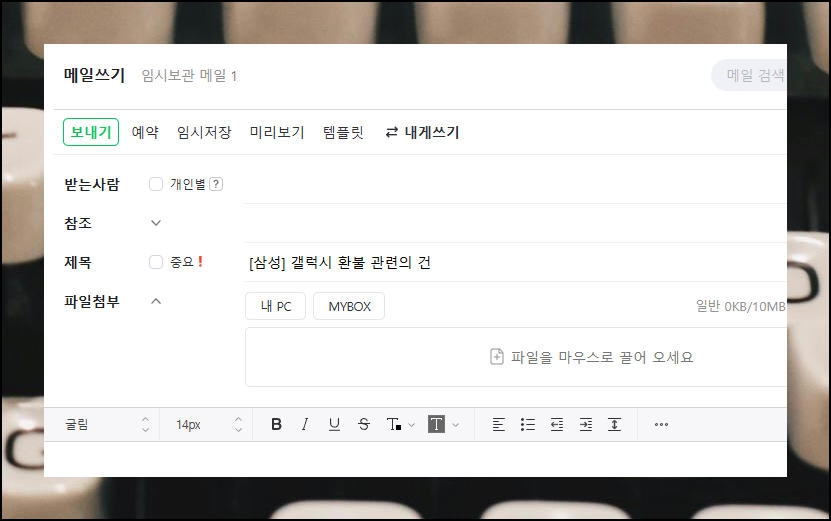 제목을 대충 작성하면 상대방이 편지를 읽지 않을 수 있어요. 요즘은 스팸 메일이 너무 많아서 사람들이 예민해졌거든요. 그래서 스팸처럼 보이지 않도록 제목을 신중하게 작성해야 합니다. 업무용으로 작성하는 것이라면 제목에 소속과 용건의 핵심을 명확하게 적어주세요. 이 두 가지만 잘 표현하면 됩니다. 예를 들어 "[삼성] 갤럭시 환불 관련의 건"이나 "[애플] A/S 서비스 문의 답변의 건"처럼 작성하면 좋아요.
