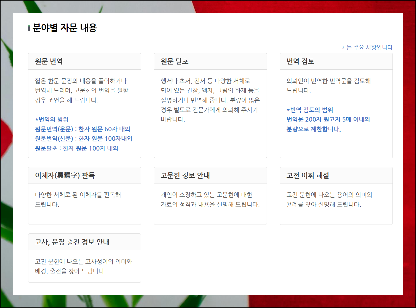 변환기 프로그램은 아니지만, 정말 고급 수준의 도움이 필요하다면 한문고전번역원 사이트를 추천해요. 여기서는 한문 고전 자문 서비스를 제공하고 있어요. 일반 변환기와는 다르게 전문가에게 직접 질문하고 답변을 받는 형태예요. 원문 번역이나 원물 탈초, 용어 문의 등 다양한 한문고전과 여러 가지 궁금증을 해결할 수 있거든요.
