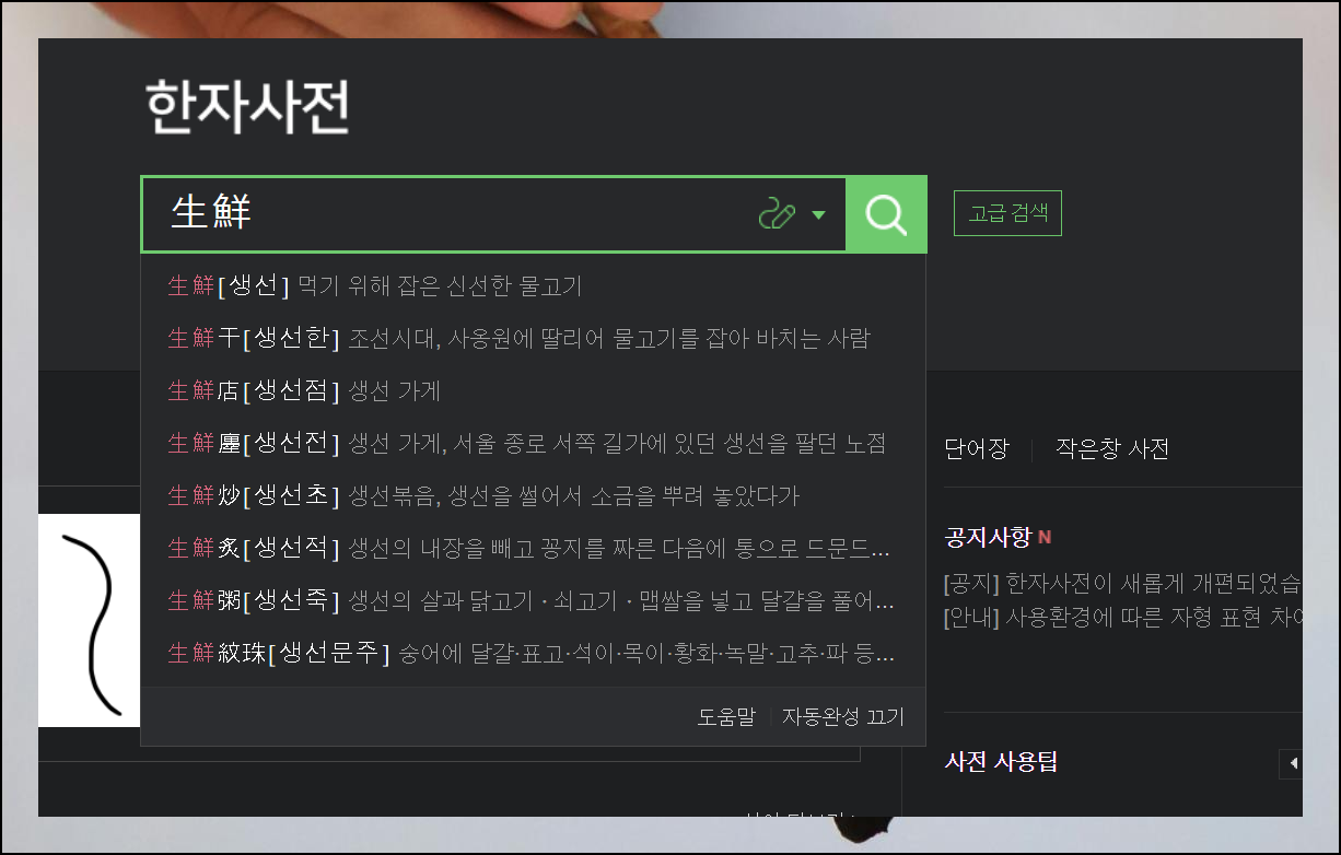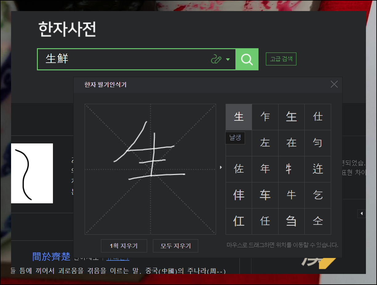 한자를 직접 타이핑하는 게 어렵다면 필기인식 기능을 써보세요. 검색 버튼 옆에 있는 아이콘을 클릭하면 이용할 수 있어요. 마우스로 문자의 모양을 그리기만 하면 인식해줍니다.