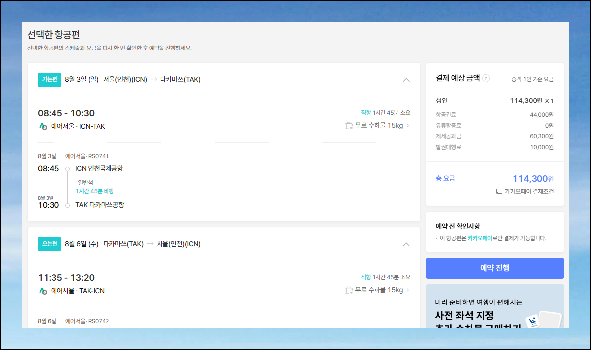 고른 항공사의 예약 페이지에서는 일본 여행 목적지와 모든 요금 항목들을 세심하게 검토한 후에 예약을 완료하시면 되요. 특히 비행기표에 포함되어 있는 수하물 규정 부분도 꼭 확인해보세요.