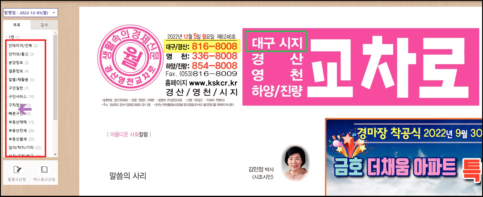▲ 좌측에 있는 목록에서 "부동산 매매"를 클릭해 볼게요. 이렇게 하면 우측에 있는 대구 교차로 신문 화면에서 빨간 박스로 부동산 매매에 대한 항목에 표시가 되는 것을 알 수 있습니다.