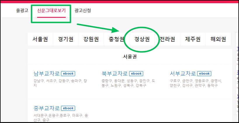 ▲ 화면 상단에 있는 메뉴에 "신문 그대로보기" 버튼이 나타났습니다. 해당 페이지에서 서울권, 경기권, 강원권, 충청권, 경상권, 전라권, 제주권, 해외권 지역의 교차로 신문 그대로보기를 이용할 수 있는데요. 대구 교차로 신문의 경우에는 경상권 쪽에서 찾아보면 됩니다.