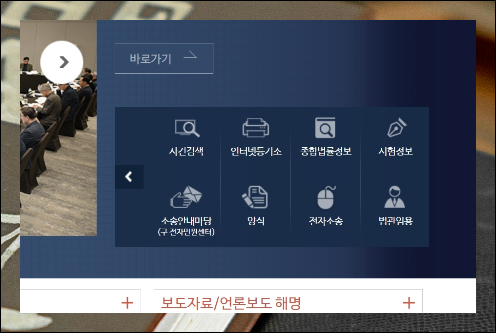 대국민서비스 화면에서 중앙 우측 영역을 살펴보면 다채로운 기능 버튼들이 정리되어 있어요. 나의사건검색은 물론이고, 부동산 등기 업무, 각종 시험 안내, 양식 다운로드 등을 한 화면에서 접근할 수 있습니다.