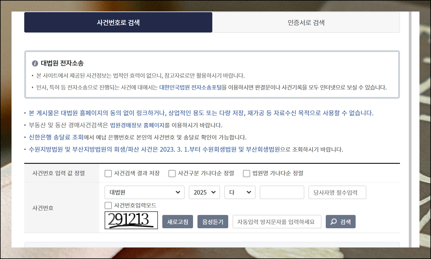디지털 인증서가 없어도 소송 사건번호만 확보되어 있다면 나의사건검색이 가능합니다. 담당 변호사에게 문의하면 해당 번호를 쉽게 알 수 있어요. 법무 담당자와 연락이 어려운 상황이라면 대법원 홈페이지에서 직접 찾아보는 대안도 있습니다.