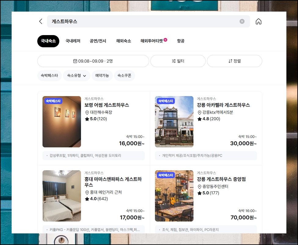 야놀자는 우리나라 숙박 플랫폼 중에서 가장 유명한 곳이죠. 게스트 하우스로 검색하면 꽤 많은 숙소 정보를 제공 받을 수 있습니다. 국내 기업이라는 점에서 개인적으로 애정이 가는 곳이기도 해요. 아마도 국내 게스트 하수스 등록 수는 이곳이 많은 편에 속할 것이라고 생각됩니다.