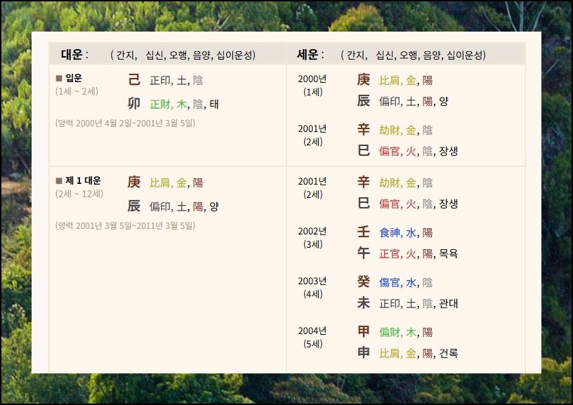 십 년 간격으로 순환하는 대운을 미리 들여다보세요. 식상, 재성, 견겁, 관살, 인수라는 다섯 갈래의 기운이 어떻게 흘러가는지 결과 안에 상세히 담겨 있어요. 나이대마다 강한 기운이 달라지기 때문에 사전에 파악해 놓는 게 좋습니다. 인생의 전환기가 언제 찾아올지 가늠하면서 장기적인 생애 설계에 활용해 보세요.