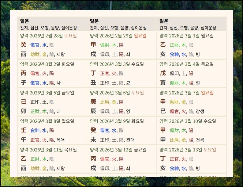 월 단위 운세 역시 만세력 분석을 통해 무료로 조회가 가능해요. 목, 화, 토, 금, 수 다섯 요소를 각기 다른 색깔로 구분해 놓아서 시각적으로 금방 알아볼 수 있습니다. 한 달의 흐름을 앞서 알면 중요한 일정을 잡을 때 참고가 돼요. 특히 직장인이나 사업을 하시는 분들에게 실질적으로 도움이 됩니다. 매월 전환되는 기운의 물결을 읽으면서 그달의 방향을 설정해 보세요.