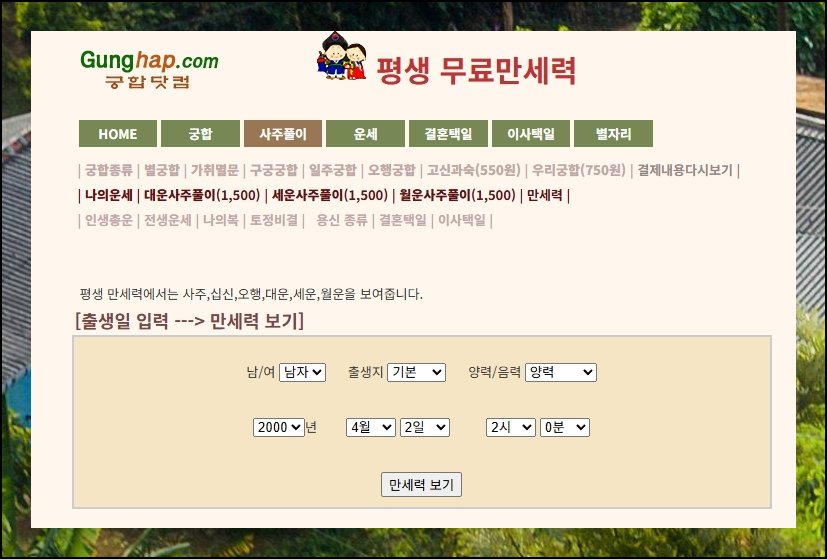 무료로 쓸 수 있는 운세 서비스를 하나 알려드리겠습니다. gunghap이라는 키워드를 검색창에 넣으면 만세력 보기가 가능한 페이지에 곧장 도착해요. 구글에서 검색하면 사주 분석이나 월운 같은 다양한 항목이 개방되어 있습니다. 카테고리별로 깔끔하게 정리되어 있어서 처음 방문하시는 분도 원하는 메뉴를 금방 찾을 수 있어요. 회원가입이나 별도의 결제 절차 없이 바로 이용 가능하다는 점도 큰 장점입니다.