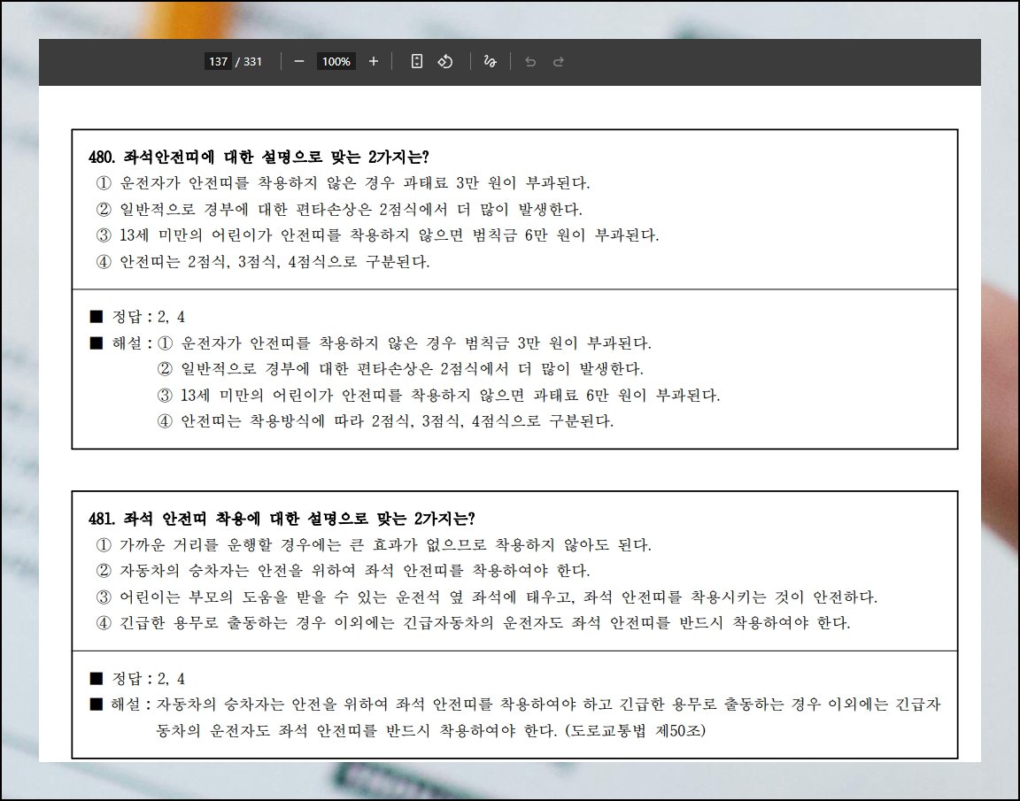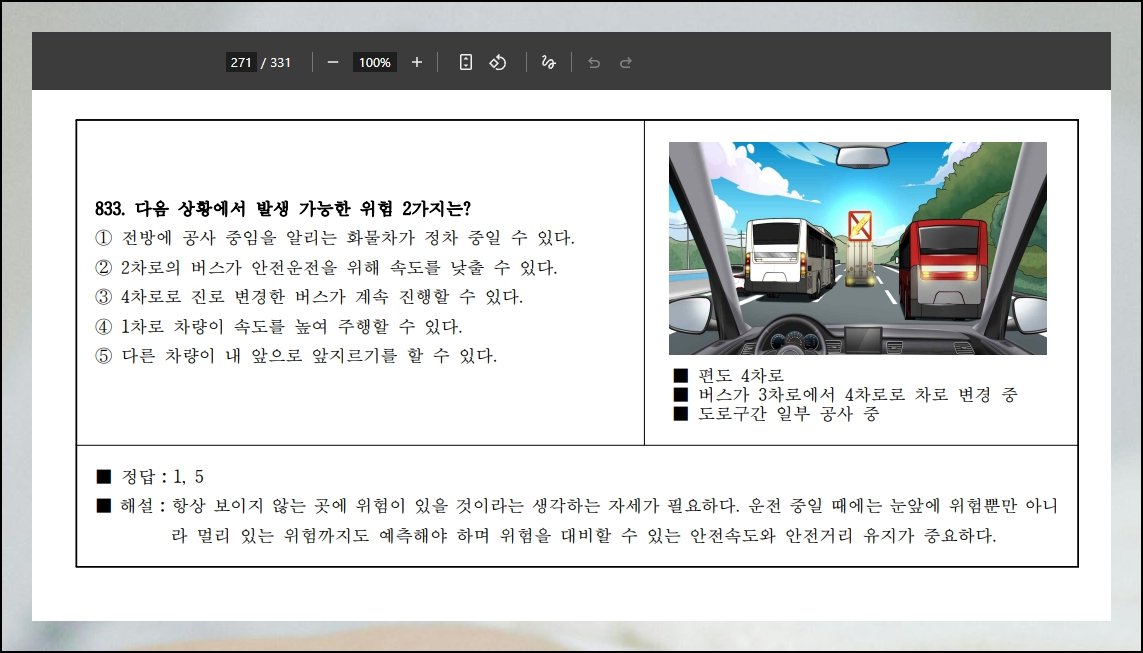 저장한 파일이 PDF 포맷이라 별다른 준비 없이 곧바로 열람 가능합니다. 비용 부담 없는 리더 앱은 검색 한 번이면 바로 설치가 돼요. 운전면허 필기시험 문제마다 해설과 정답이 함께 적혀 있어 사설 강좌 없이 독학으로 충분합니다. 자투리 시간마다 반복해서 보면 핵심 개념이 자연스럽게 머릿속에 자리 잡아요.