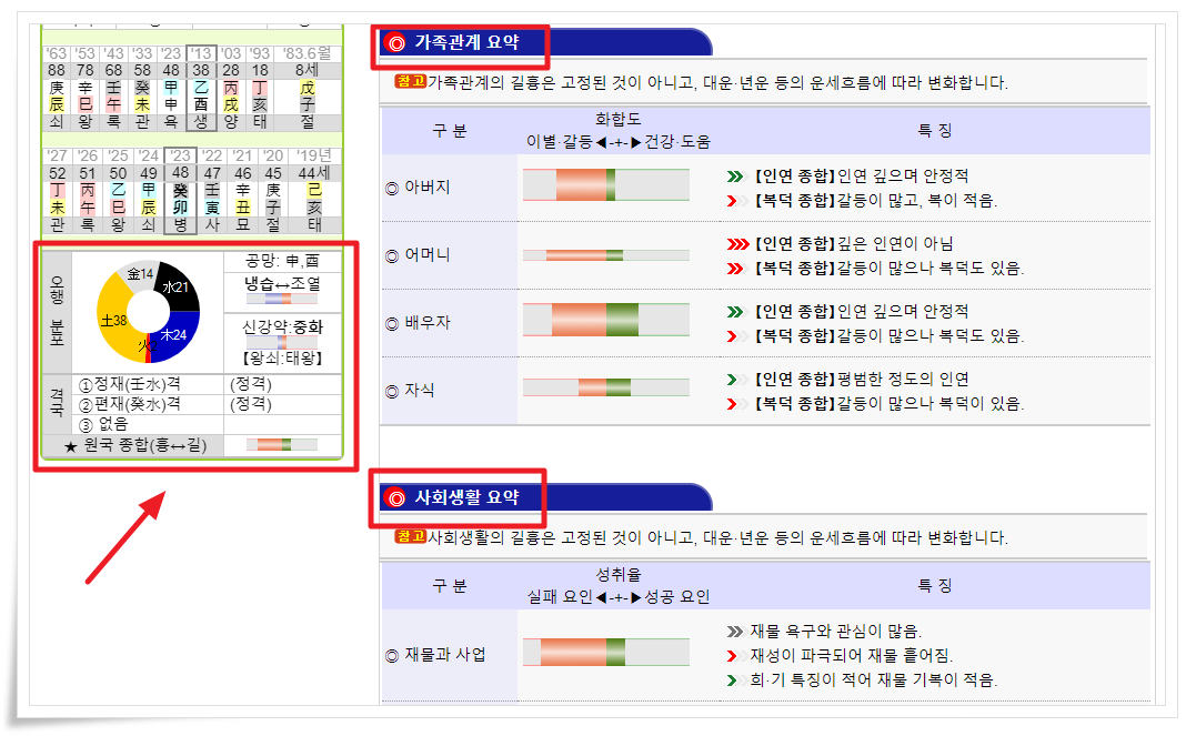가볍게 살펴본 후 오른편 화면에 나타난 가족관계와 사회생활에 관련된 해석 결과를 확인해 보세요.