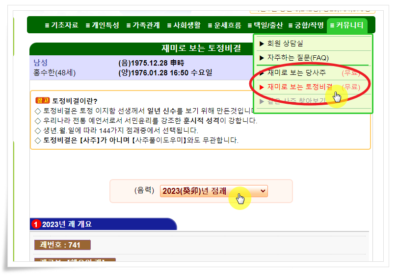 사이트 메뉴에서 [커뮤니티]를 선택하면 [재미로 보는 토정비결 (무료)] 메뉴가 나타납니다.