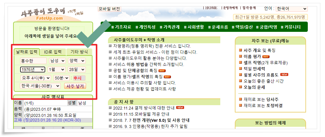사이트에 접속하면 좌측 상단에 사주 정보를 입력할 수 있는 공간이 있습니다.