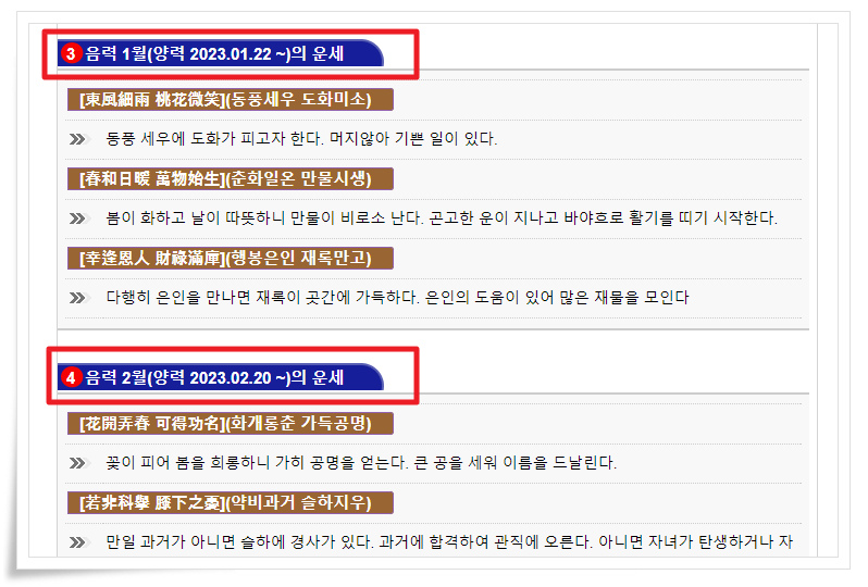 음력을 기준으로 월별 운세가 구분되어 있으니 이를 참고하시길 바랍니다.