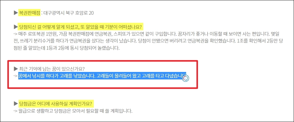 다음은 제가 최근에 인상 깊게 본 복권 당첨자의 인터뷰 입니다. 돼지가 나오는 것은 많이 들어봤어도 고래를 타고 다니는 꿈은 처음 봤거든요. 다음에 고래를 보게 되면 로또 복권 구매를 열심히 해봐야겠네요. 추가적으로 당첨자가 이용한 판매점 주소, 기분, 자금 이용 계획에 대한 이야기도 들어볼 수 있었는데요. 참 부럽습니다.