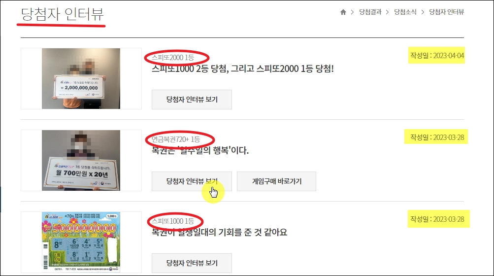 로또나 다양한 복권에 당첨되는 꿈을 살펴볼 수 있는 인터뷰 페이지가 열렸습니다. 여러 가지 복권에서 큰 상금을 획득한 분들의 인터뷰가 나타나는데요. 여기서 보고 싶은 것을 클릭하면 로그인 없이 바로 내용을 읽을 수 있어요. 작성일을 보면 알 수 있듯이 계속 업데이트가 되고 싶습니다.