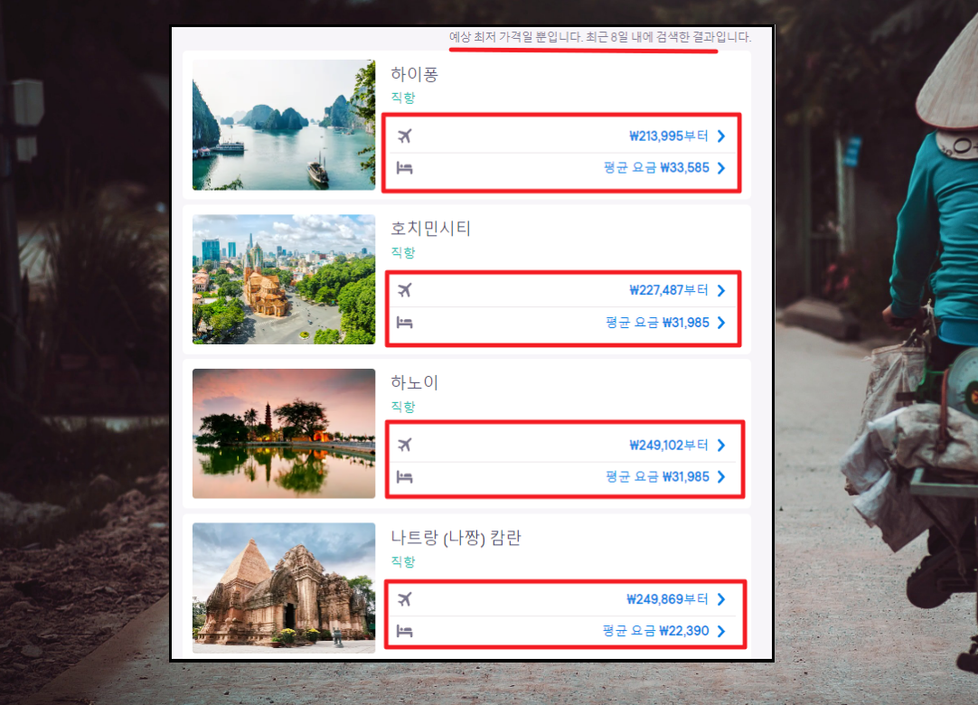 도착지를 "베트남"으로 지정하면 위와 같이 베트남의 여러 지역에 대한 항공권 요금을 비교해 볼 수 있습니다. 12월에 운행하는 비행기에 대하여 "하이포"로 가는 경우 21만원대, "호치민시티"로는 23만원대, "하노이"로는 25만원대, "나트랑 캄란"으로는 25만원대의 가격으로 최저가 요금이 형성이 되어 있음을 알 수 있습니다.