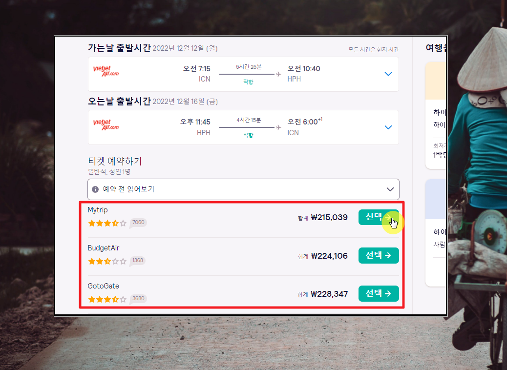 하이퐁에 가는 날짜를 선택했다면 다음으로 할 것은 항공편 선택입니다. 자신이 선호하는 비행기 탑승 시각과 항공사를 기준으로 항공편을 선택하면 되는데요. 가장 저렴한 티켓을 찾고 있다면 최저가 순으로 정렬을 한 후 맨 위에 위치한 항공편을 선택하면 됩니다. 그럼 바로 예약 진행을 할 수 있죠.