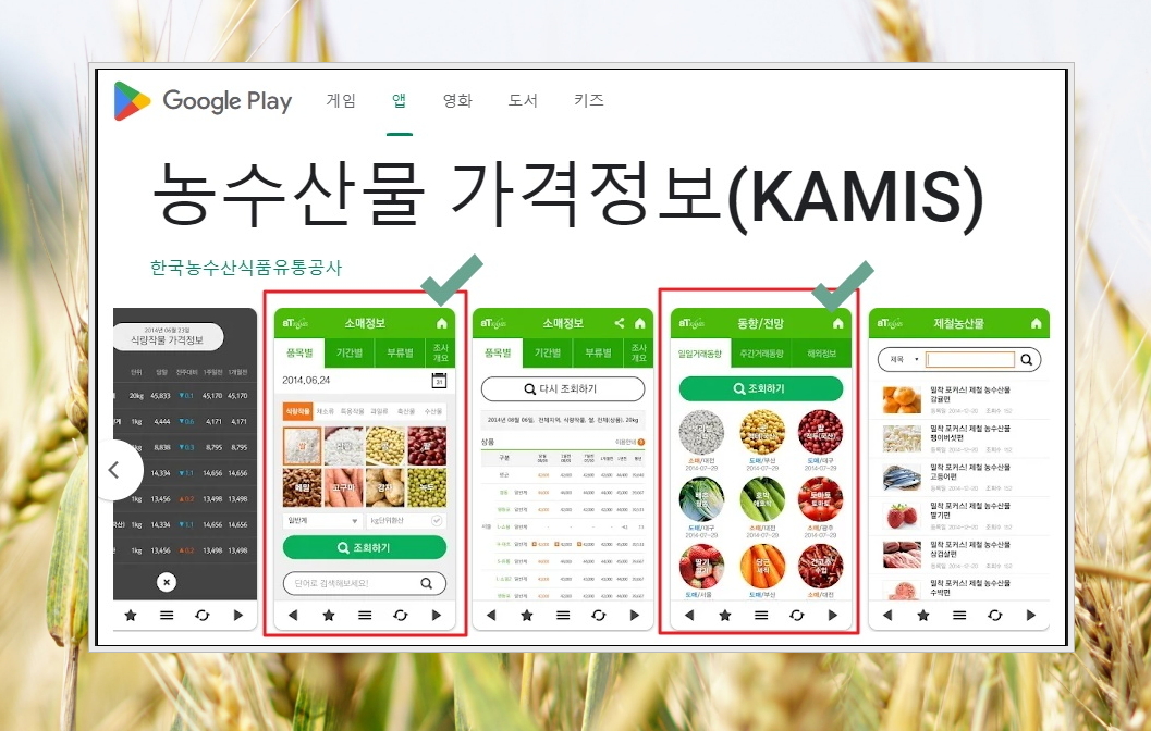 스마트폰으로도 농산물에 대한 정보에 쉽게 접근이 가능한데요. 구글 플레이 스토어에서 "농수산물 가격정보" 또는 "KAMIS"를 검색하면 해당 앱을 찾을 수 있습니다.