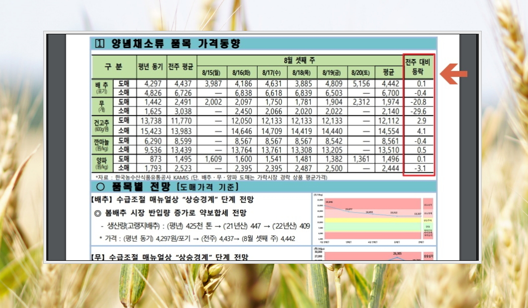 8. 농축산물 주간 동향 자료를 열어보았습니다. 농산물 중에서 양념채소류에 속하는 배추, 무, 건고추, 깐마늘, 양파에 대한 시세가 깔끔하게 정리되어서 나타나는 것을 볼 수 있습니다. 그 아래에는 각 품목에 대한 전망과 그래프가 나와 있어서 앞으로의 시세 흐름을 파악하는 데에도 도움이 됩니다.