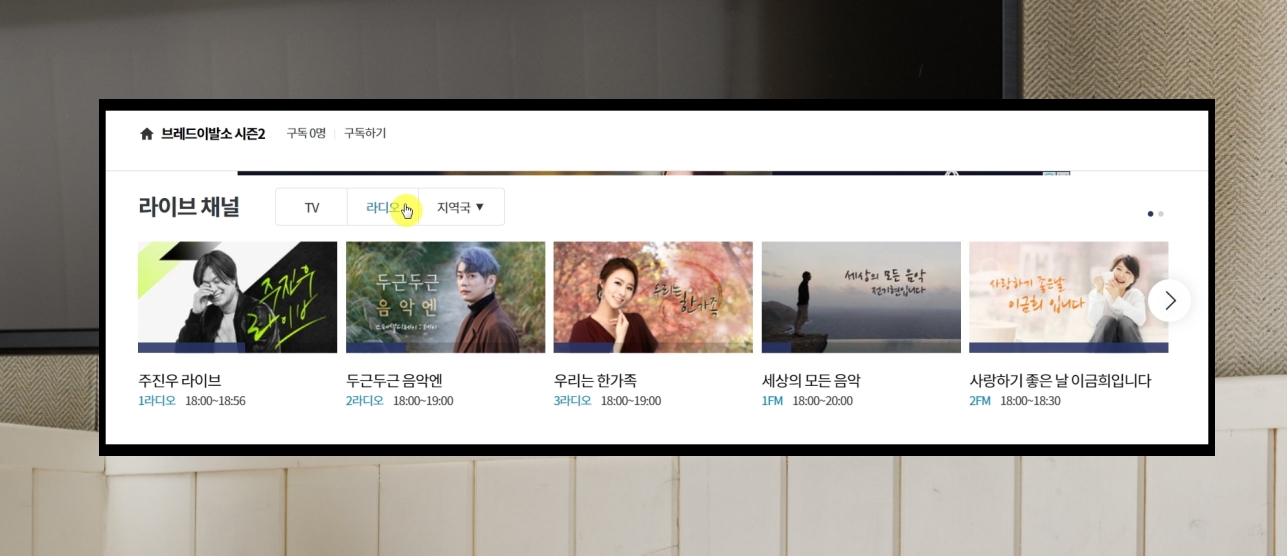 10. 마지막으로 영상 화면에서 하단 부분을 보면 다른 실시간 채널이 나타납니다. 라디오 채널도 이용이 가능하오니 참고해 주세요.