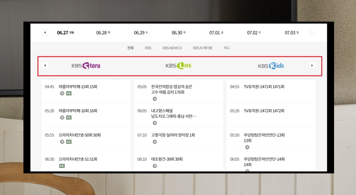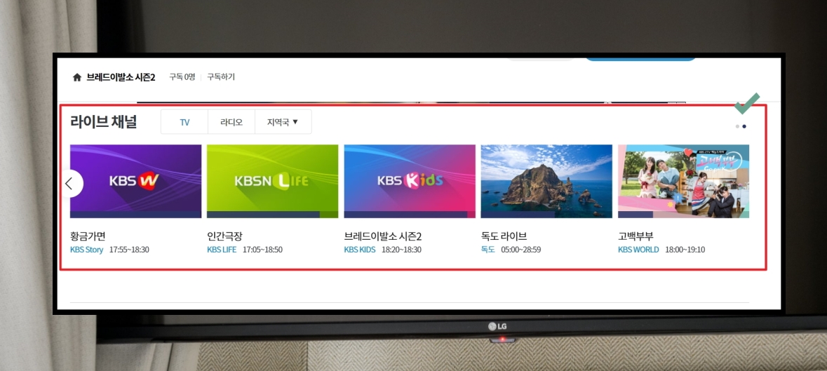 8. 드라마는 kbs story, 인간극장이나 사극을 보고 싶을 때에는 kbs life, 아이들을 위한 kids 프로그램이 마련되어 있습니다.
