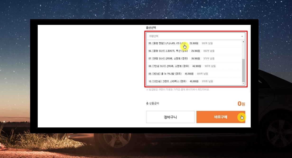 옵션 부분을 보면 차량 선택을 할 수 있는데요. 여기에서 모델별 서울 렌트카 이용 가격을 확인할 수 있습니다.