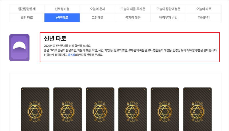 지금까지 사주팔자 간단히 보는법을 자세하게 알려드렸는데요. 방금 이용한 토정비결 외에도 10가지 이상의 운세 서비스가 있어요. 그 중에는 타로점도 있는데요. 카드를 선택하기만 하면 되기 때문에 이용법이 정말 간단해요. 해석은 신기하게 잘 맞고요.