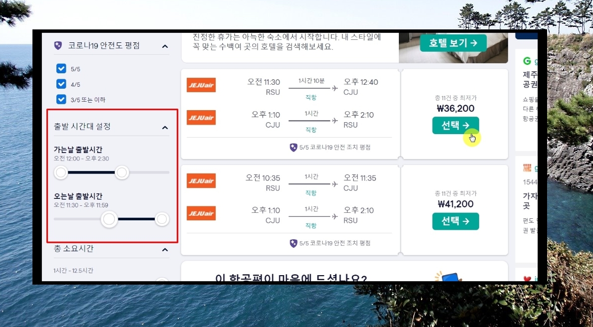 5. 날짜 선택 이후에는 비행기 탑승 시간대와 항공사를 지정해야 해요. 오른쪽 화면에 보면 여러 항공사의 항공편이 보이는데요. 항공권 가격을 참고해서 선택해 주세요. 선택하면 바로 제주도 비행기 티켓 예약을 할 수 있어요. 원하는 출발시간에 탑승할 수 있는 항공편만 보고 싶다면 좌측에 있는 "출발 시간대 설정"을 해주면 돼요.